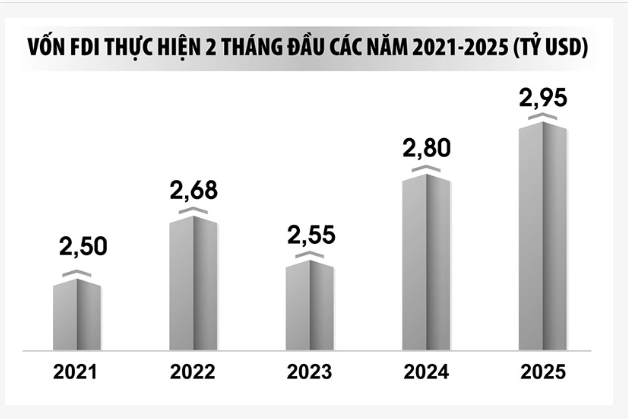 Ông Nguyễn Bích Lâm, nguyên Tổng cục trưởng Tổng cục Thống kê cũng ghi nhận điều này. Theo ông, việc giải ngân vốn FDI đạt trên 3,2 tỷ USD – mức cao nhất của 2 tháng đầu năm trong 5 năm qua – là tín hiệu cho thấy dòng vốn không chỉ dừng ở cam kết, mà đang được giải ngân thực chất. Ông gọi đây là một “điểm sáng” của nền kinh tế.
